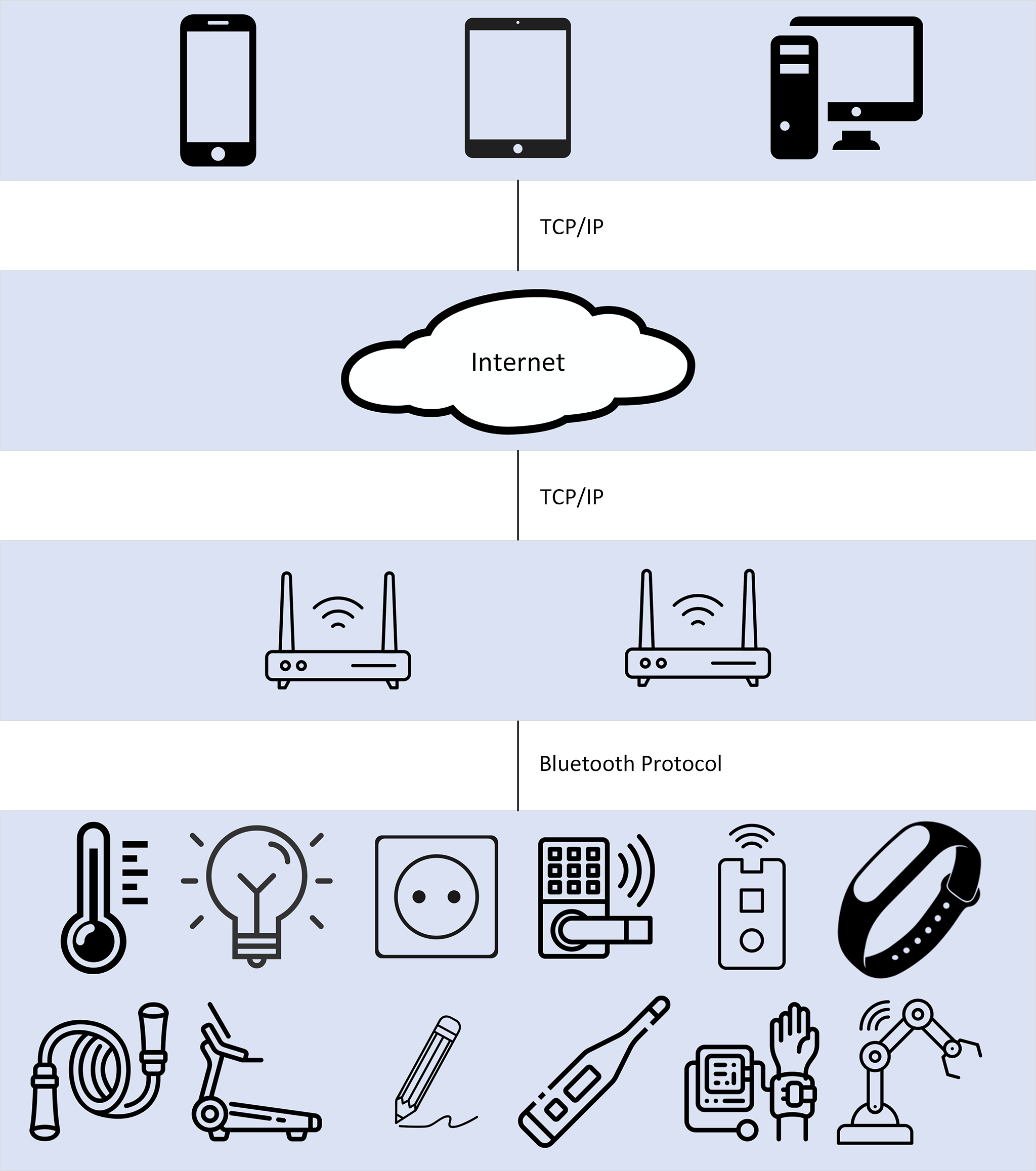 物联网(IoT)是由终端设备、通信网络和应用软件组成的系统。 蓝牙物联网是利用蓝牙技术实现物联网设备之间的短距离无线连接和数据交换的技术体系。它适用于设备密度高、功耗要求低、数据传输量较小的场景,是物联网的重要分支之一。 蓝牙物联网架构通常由设备层、网络层、平台层和应用层组成,其中最重要的是网络层,其性能决定了蓝牙物联网的容量、带宽、时延、数据吞吐量等性能指标。